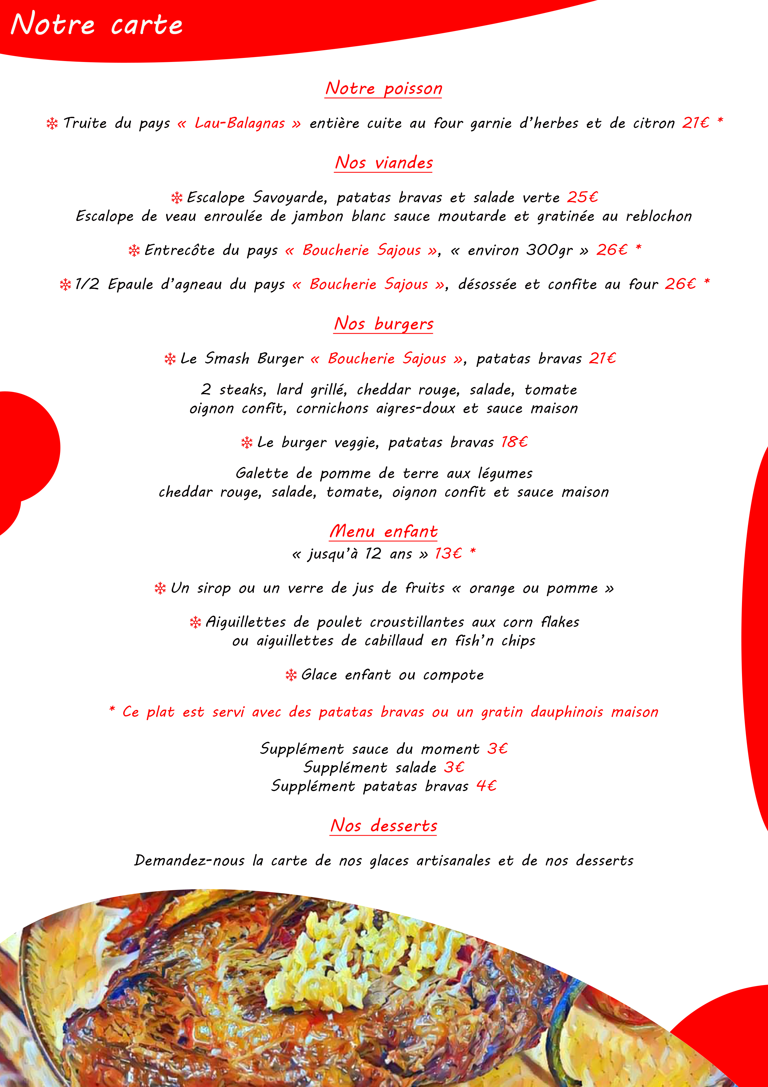 Dans un cadre montagnard chaleureux et cosy, vous allez vous régaler de viandes des Pyrénées ( boeuf, agneau du pays Toy, épaule d'agneau confite, tartare ...), de spécialités fromagères montagnardes ( brebis au four, fondues, raclette à la braise "hiver") et de la truite des Pyrénées de Lau Balagnas …
